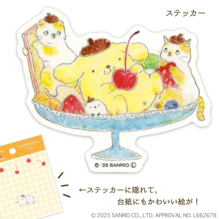 手帳やノートに貼ったり、スマホケースに挟んだり…ポチャッコやポムポムプリンと一緒にスイーツを堪能するにゃんこたちの、かわいらしい姿が日常でふと目に入ったらハッピーな気分を味わえるステッカーです。
